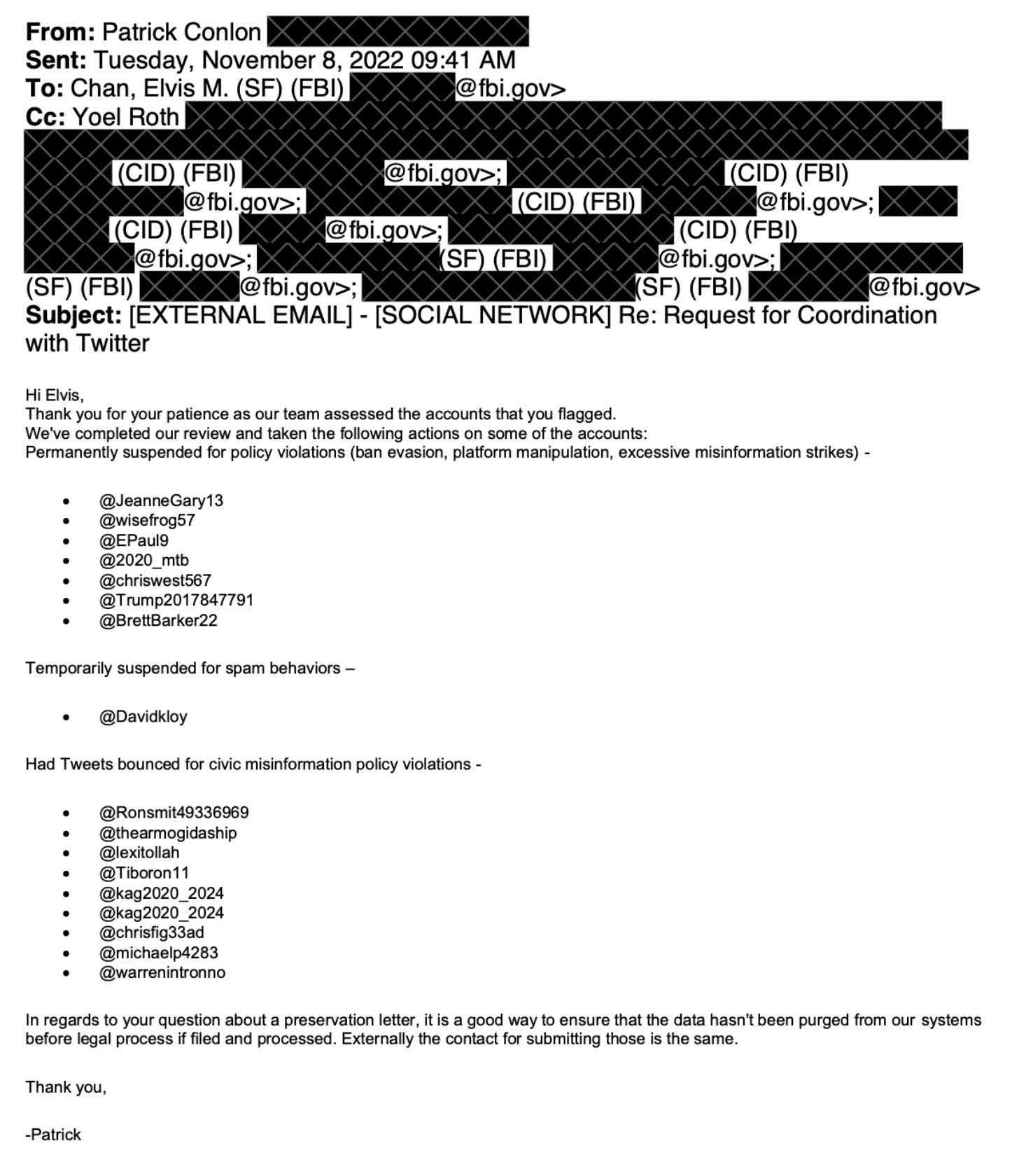 Former Twitter censorship employee Patrick Conlon managed to scrape up violations against each and every account on Agent Chan’s list (except for Billy Baldwin). Conlon’s response to Chan appears below. Take note all the other FBI.gov email addresses that were carbon-copied on Conlon’s email to Chan: