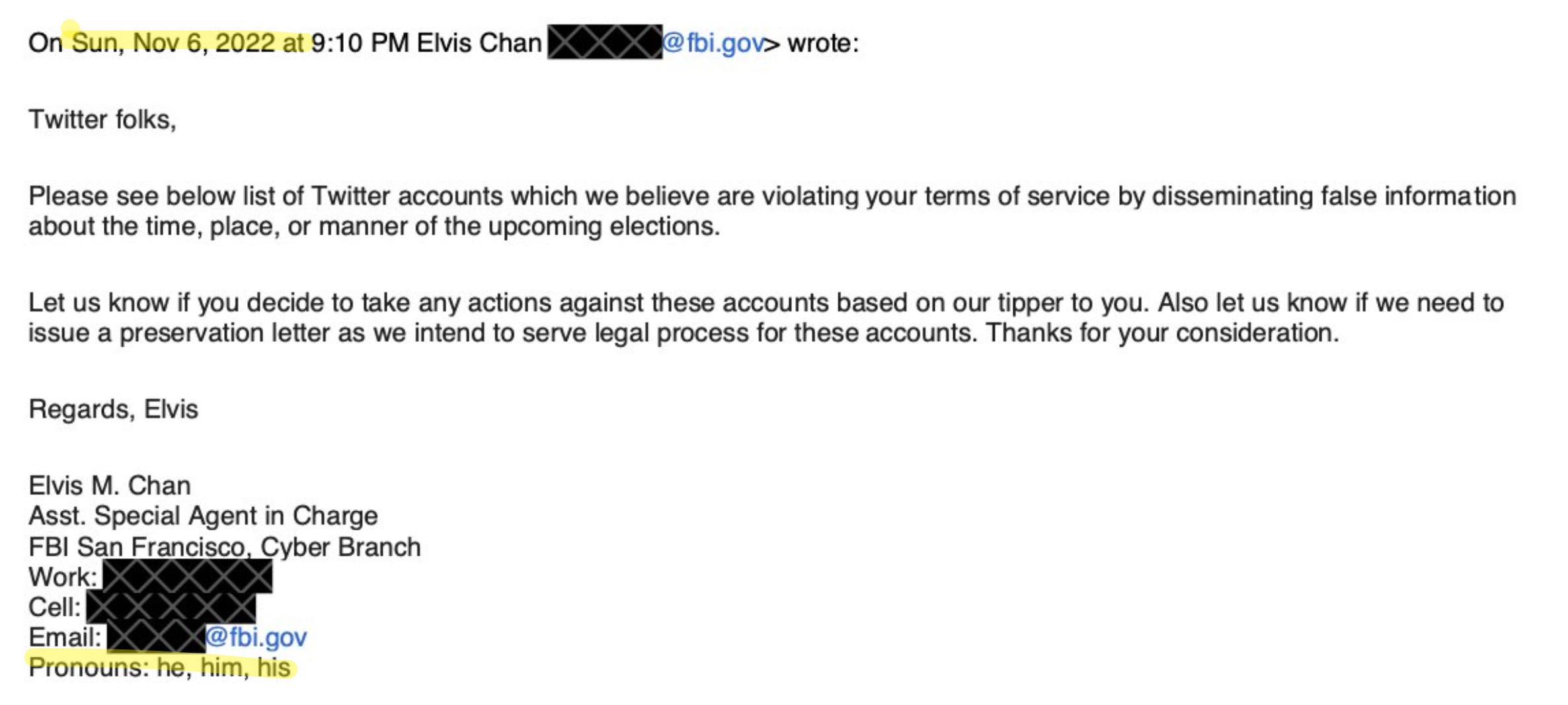 For context, over the last few years Agent Chan has been assigned to the Twitter project. He was recently deposed in the Missouri v. Biden case, and he’s been the subject of several of Matt Taibbi’s “Twitter Files” posts over the last couple weeks.