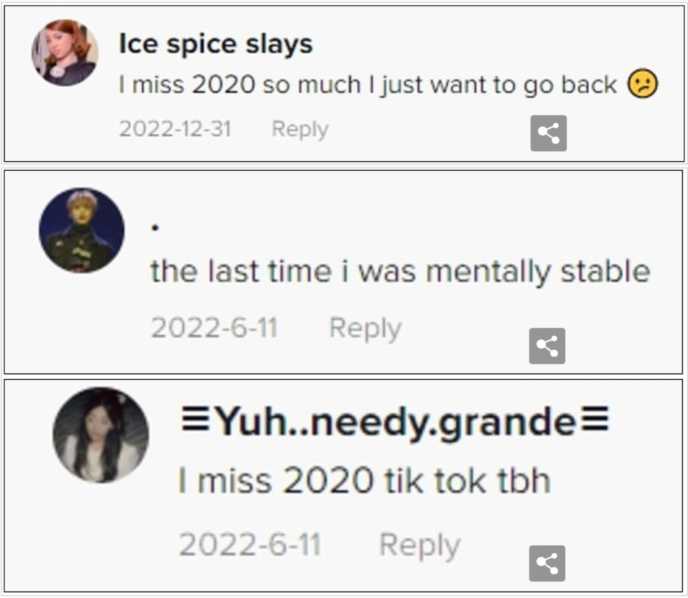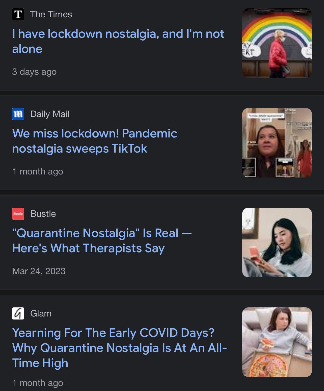The other articles were more troubling. The Daily Mail article quoted people saying things like, “Crazy how looking back at it, 2020 was one of the best years of most of our lives,” and “The way we took quarantine for granted makes me want to cry. There’s literally nothing I miss more than beginning of 2020.”