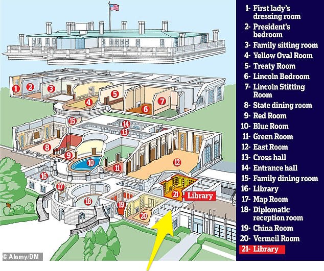 Unlike the Hill, which misinformed its readers that the cocaine was found “near” the White House, suggesting somebody threw it over the fence or something, the Daily Mail included a very helpful infographic, pinpointing exactly where the abandoned party supplies were found, right on the Residence’s ground floor, in a non-public area right where Hunter likes to “work” on his laptop. (Well. Hunter “works,” if downloading Romanian upskirt videos counts. It does take SOME effort, after all.)