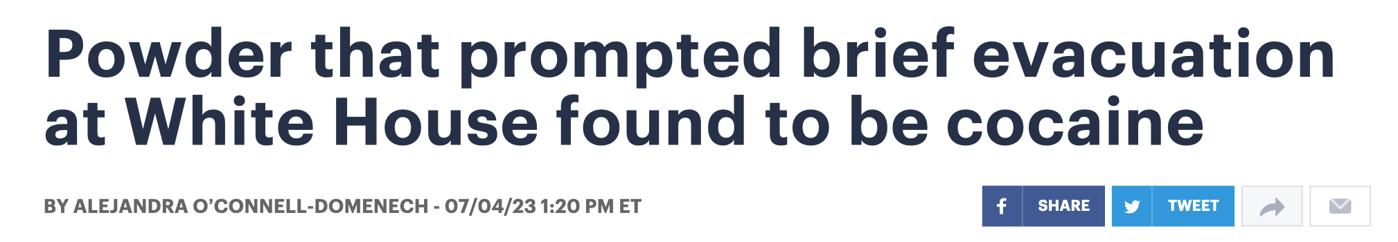 In case you missed it, on Sunday night, an unidentified person found a plasticine envelope containing a fine white powder in the White House. The Secret Service promptly and properly cleared the building and brought in Hazmat, in what turned out to be an unnecessary and humiliating evacuation of the Nation’s Most Iconic Building and Seat of Power, since the white power was actually just somebody’s leftover cocaine stash.