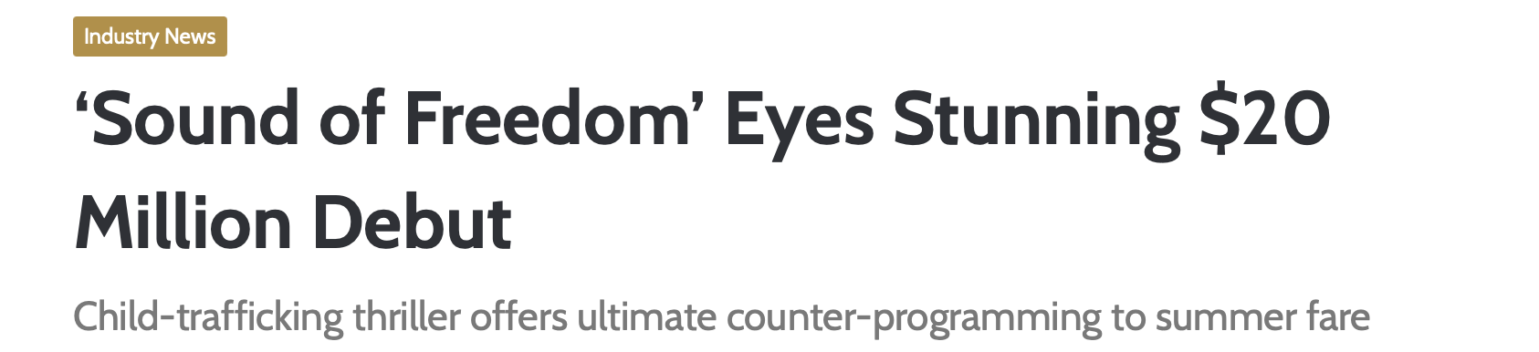Despite being shown on a fraction of national theater screens than other movies starting this week, and lacking CGI effects or any massive marketing budget, the Sound of Freedom blew out the competition and has taken the top slot this week for an opening movie.