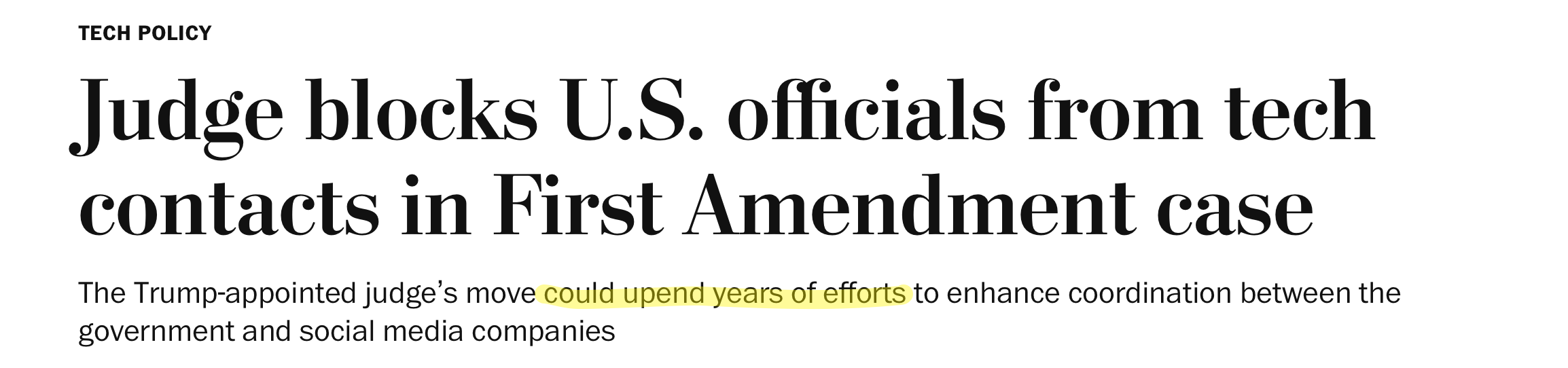 Haha, the sub-headline explained the decision will “upend years of efforts to enhance coordination between government and social media companies.” As if that were a bad thing. At least they’re admitting it happened now.