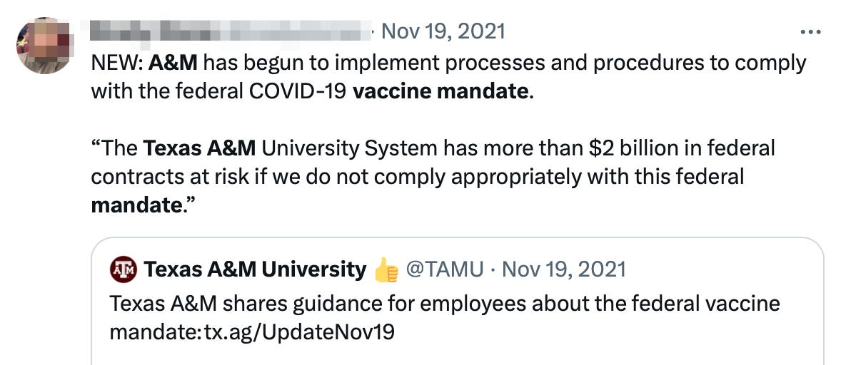 Texas A&M has now, for some reason, deleted its covid jab mandate page, which only returns a cute, dog-themed 404 error (“Reveille is on the hunt, but she can’t retrieve the page you’re looking for!”).