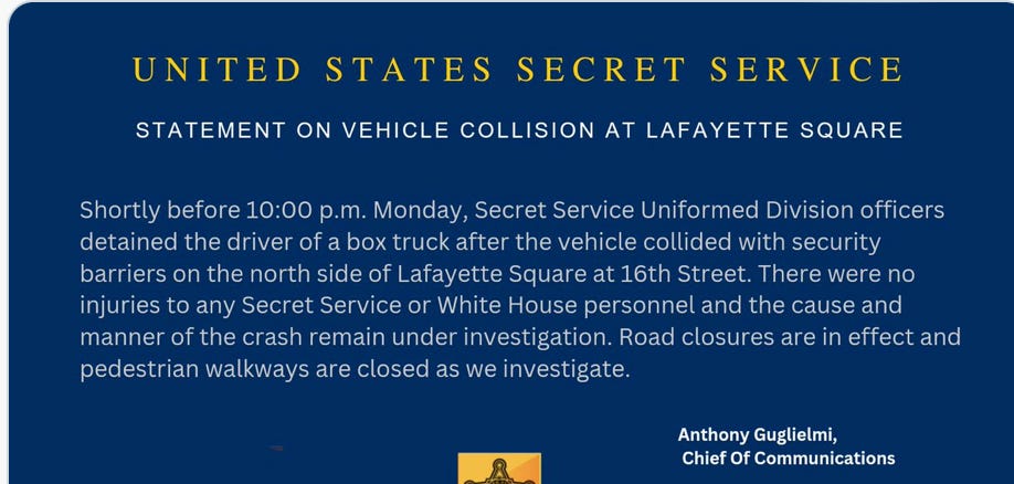 Shortly before 10:00pm last night, an empty U-Haul truck attempted to drive over the barriers at Lafayette Park in Washington, DC, which is a few blocks from the White House, leading every report of the story to claim it was a daring and nearly-successful attack on the White House itself, probably an attempt to assassinate Joe Biden by driving over him, and it was JUST LIKE when those drones got blown up over the Kremlin.