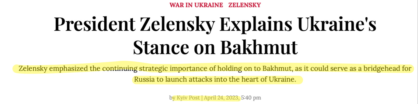 The long article quotes lots of armchair military experts explaining how useless Bakhmut was, even as a symbol of anything. It really makes you wonder what those idiotic Russians have been thinking. Then, only late in the article, in the second-to-last paragraph, the Times finally gets around to offering the explanation for the battle from the actual source — the decision maker, the chief of Ukraine’s armed forces, Zelensky: