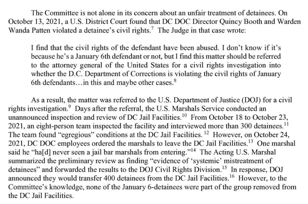 Among other things, the letter explained that in 2021, a federal judge found appalling human rights abuses among the J6 detainees, and the DOJ promptly ordered an investigation. But the DC Department of Corrections refused to let US Marshalls enter the jail, and apparently that’s basically where things stand. Despite a report stating that the J6 prisoners would be relocated to a normal facility, nothing ever happened.