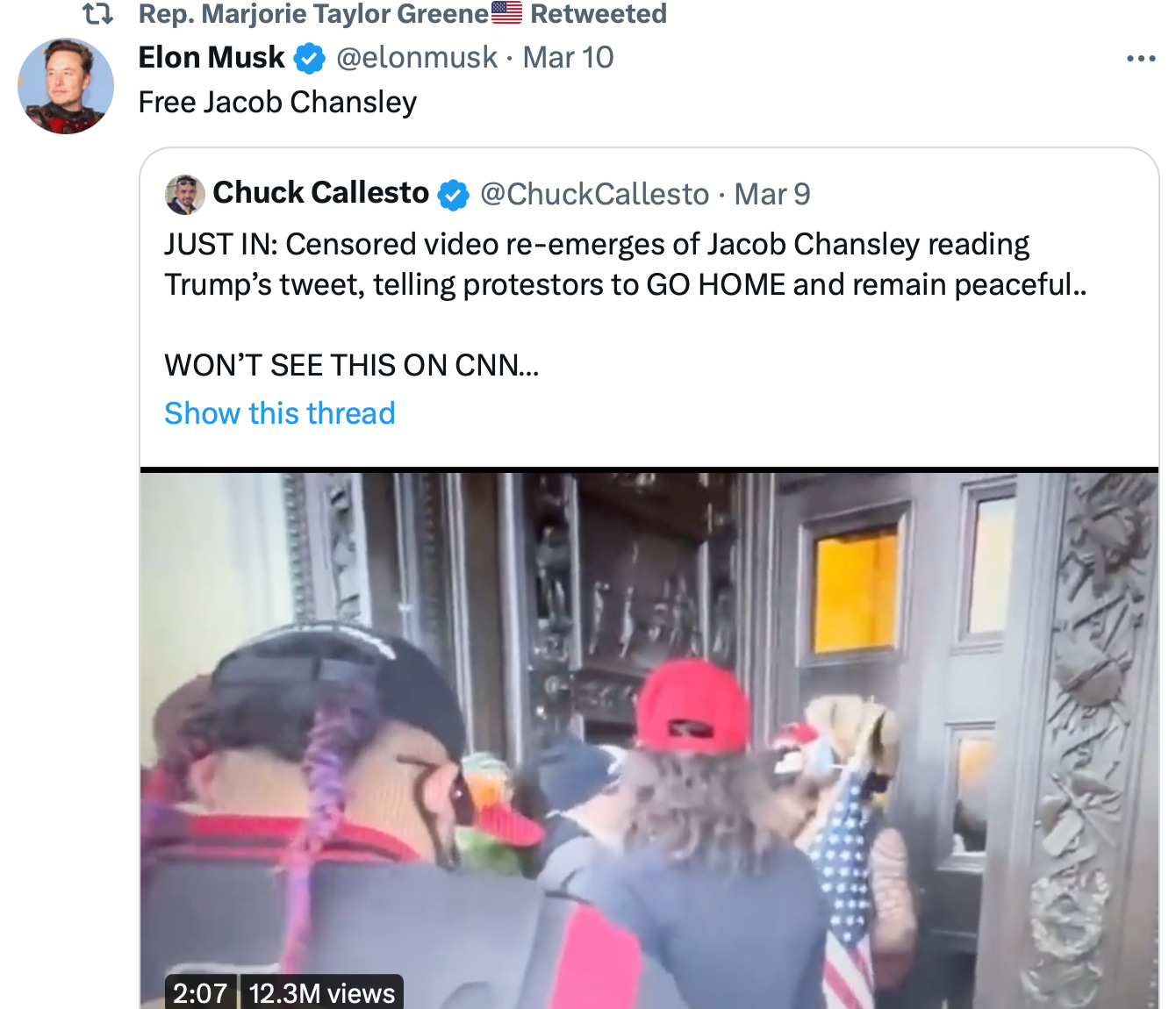 Elon Musk joined the debate Friday, coining the slogan “Free Jacob Chansley.”