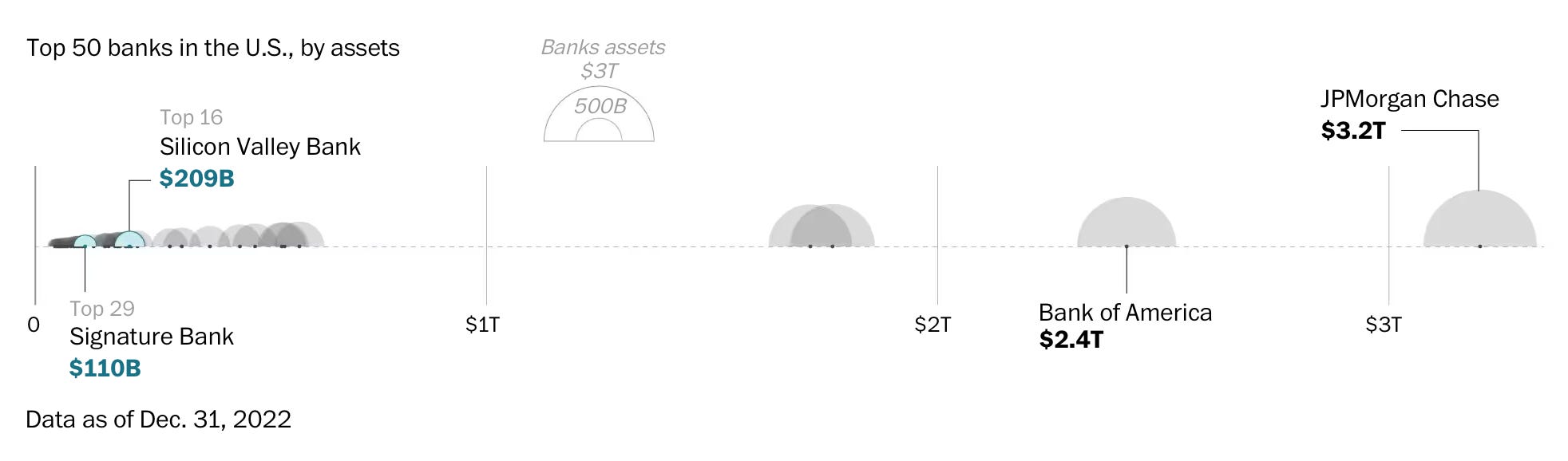 For example, the Washington Post ran a meditative story yesterday about how both cratered banks specialized in high tech, a sector experiencing some “growing pains” at the moment. So it’s probably just a tech problem and not a general banking problem. WaPo also published some reassuring infographics meant to show how relatively small the two failed banks were, even though they were the second- and third-largest financial failures in US history:
