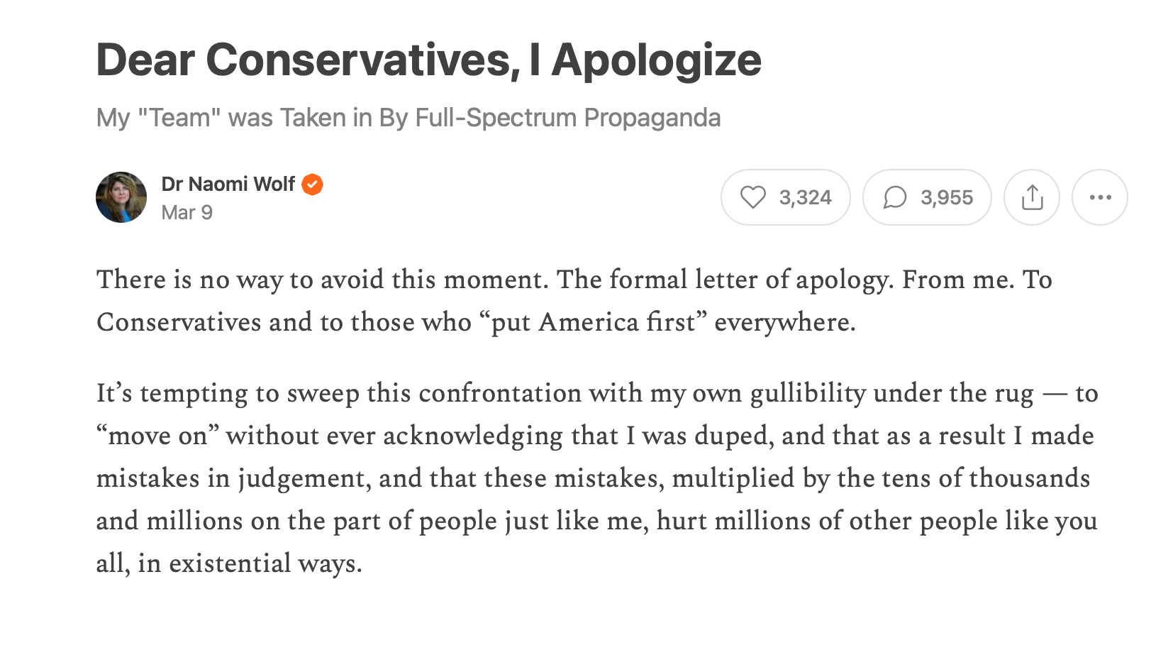 🔥 Meanwhile, Naomi Wolf published an apology letter on her Substack Thursday, apologizing for believing corporate media’s January 6th narrative: