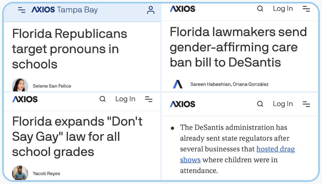 🔥 There is a new corporate media narrative featuring new attacks on Governor DeSantis. Democrats are trying to paint DeSantis as obsessed with gay people, bordering on some kind of homophobic mania. Here are a few recent selections to give you the idea: