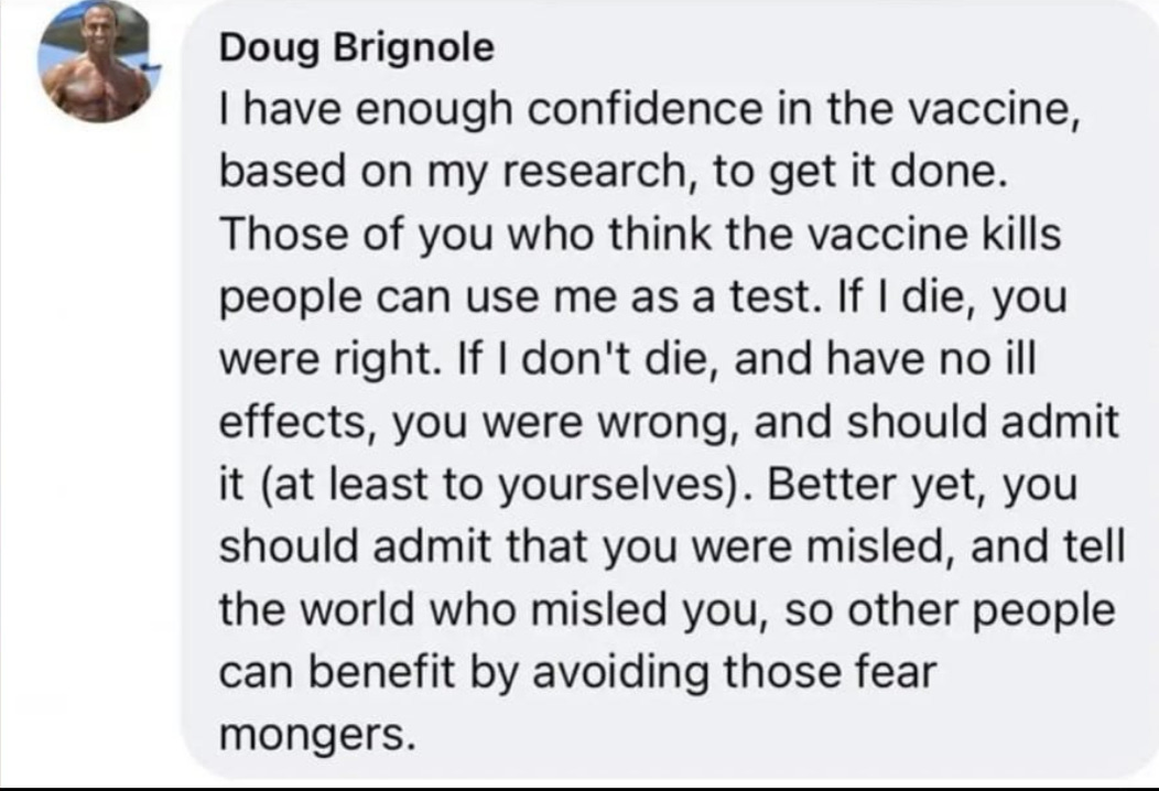 💉 Doug Brignole was the 63-year-old bodybuilder, trainer, and author who bragged “Use me as a test — If I die, you were right,” then died one week after taking a pre-travel booster shot last October.