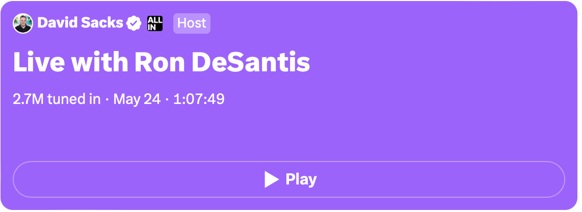 🔥 Last night’s high-tech debut of Governor DeSantis’s official presidential candidacy on a Twitter space launched in a shower of sparks, as the weight of nearly 700,000 attending users made Twitter’s supercomputer repeatedly crash. After about five minutes of rebooting, Twitter opened up a new space with carefully throttled access, starting at about 130,000, and successfully dialed it up to just under 300,000 attendees before the event was over.