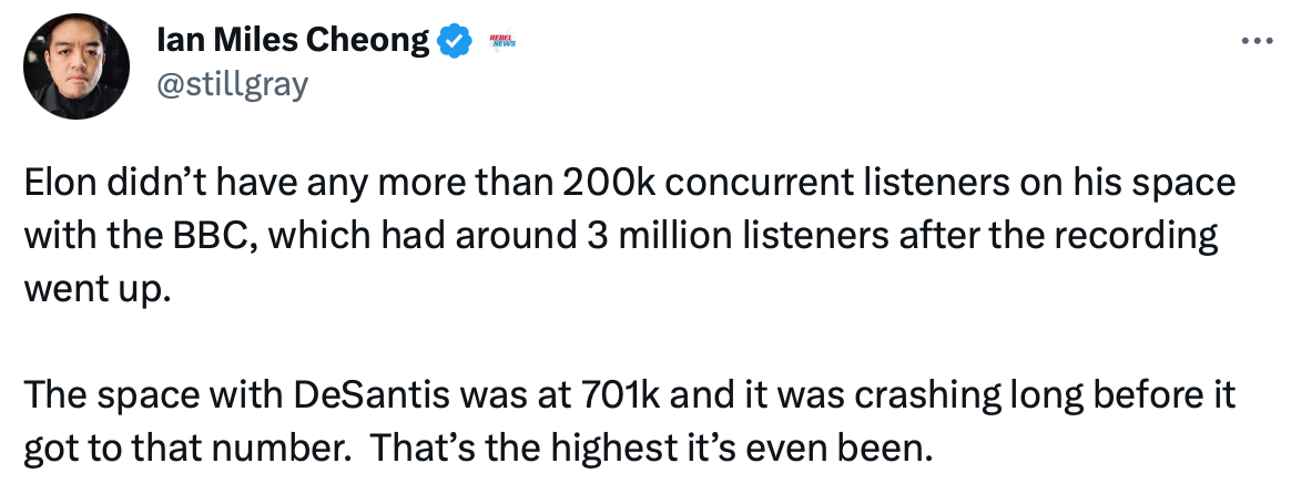 Apparently both DeSantis’ original Twitter space (700K) and the replacement one (300K) exceeded the highest number of concurrent users in a Twitter space, ever: