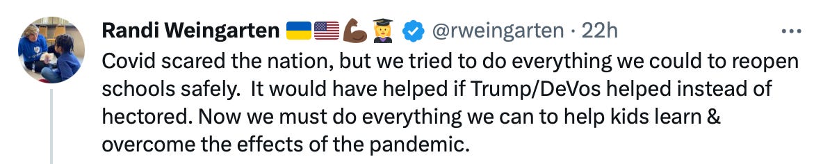 🔥 Disastrous Teacher’s Union Leader Randi Weingarten, who absolutely championed school closures for three years, and who is now on a Fauci-like retconning tour claiming — and I am not making this up — that she always advocated for open schools.