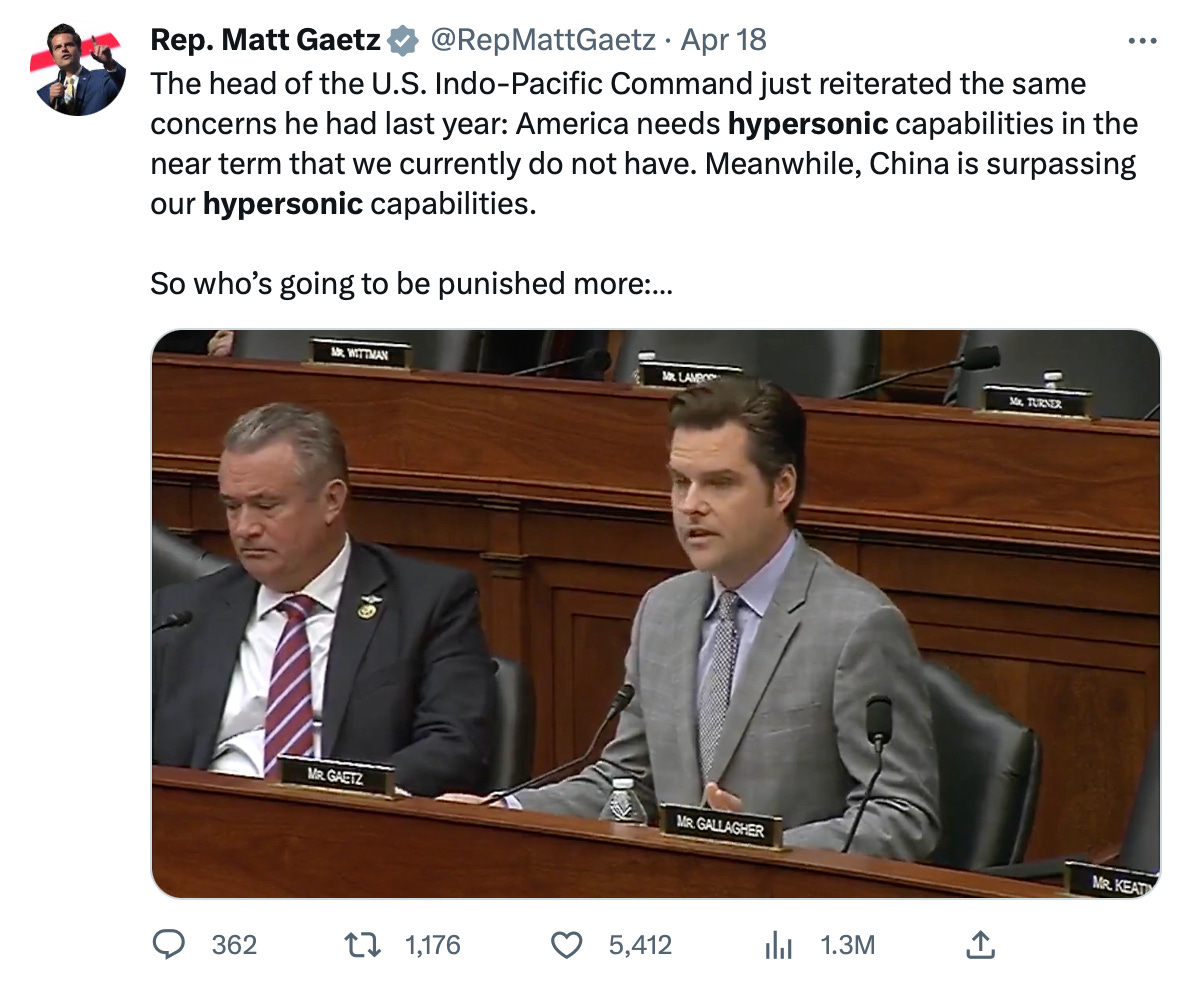 Representative Gaetz angrily concluded, “For the last 30 years, the United States has been building aircraft carriers that will never get into the fight.” The lawmaker’s questioning — and a top admiral’s reluctant answers — made it perfectly clear the Biden Administration knew about the country’s hypersonic shortfall since early 2021, and failed to do anything about it.