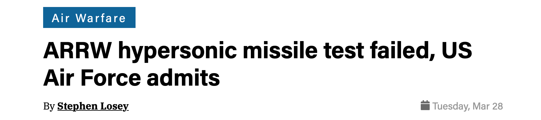 In late March, Defense News ran a story confirming the United States’ poor hypersonic preparedness. We lag far behind: