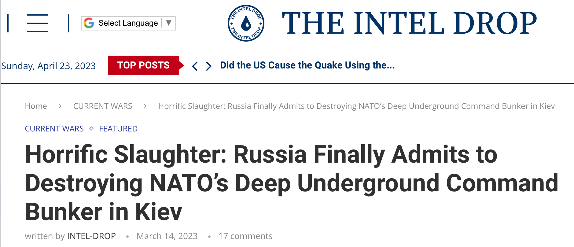 What we DO know is that Ukraine (apparently assisted by US forces) conducted an attack on a civilian neighborhood inside Russian borders in February. We also know that Russia has recently used hypersonic Kinzhal missiles in Ukraine. The highly-suggestive but unverifiable part is the claim that Russia retaliated by attacking Kiev (or Lviv) with six hypersonic Kinzhal missiles, destroying a 120-meter-deep military bunker housing 100-300 top Ukraine and NATO generals, who were leading Ukraine’s military campaign until they were hypersonically snuffed out.