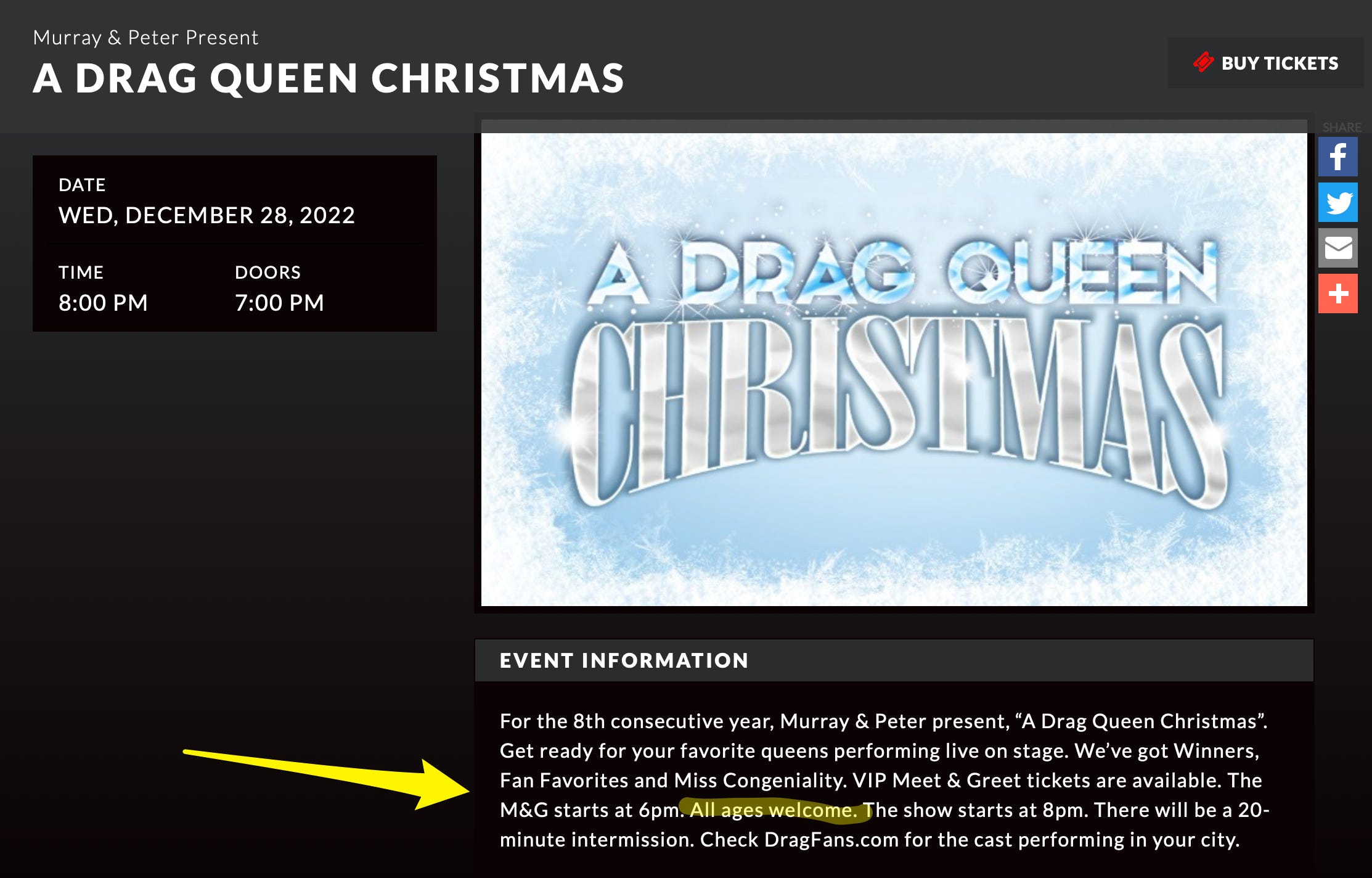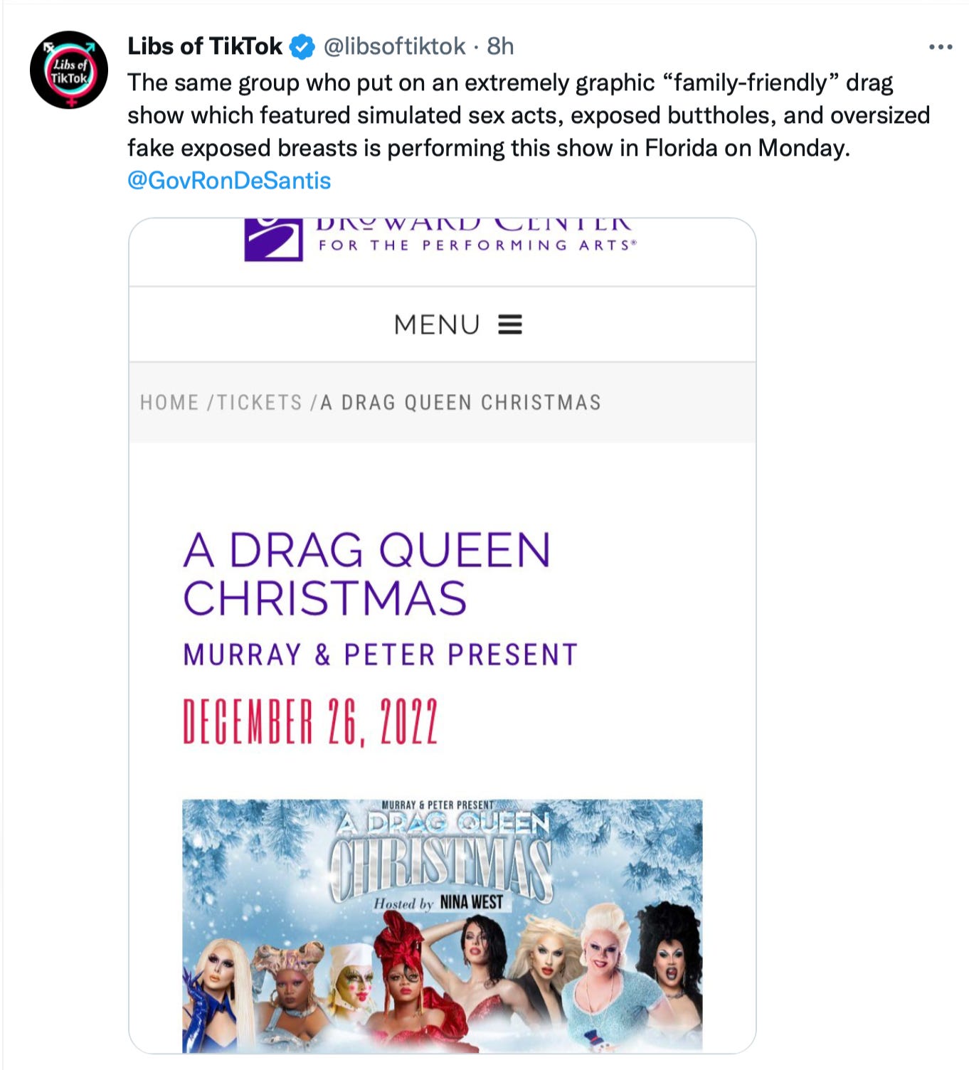 🔥 Meanwhile, the alert columnist at Libs of TikTok reported yesterday that, down in South Florida, the illustrious Broward Center for the Performing Arts will perform the gala, family-friendly show, “A Drag Queen Christmas,” on December 26th.