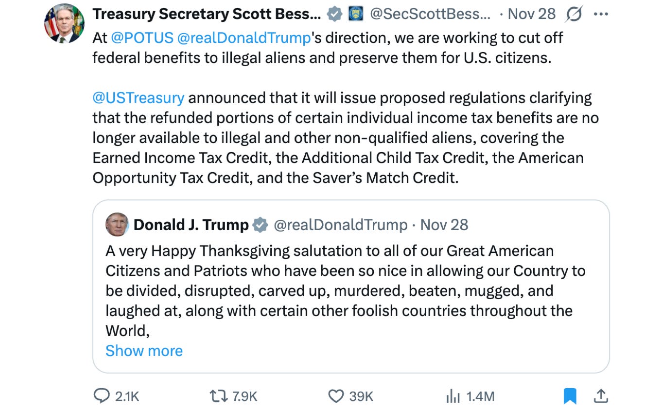 🔥 On Saturday, Newsweek ran a story headlined, “Scott Bessent looks to cut off tax benefits for illegal migrants.” In the wake of the DC shootings, President Trump published a fiery Thanksgiving post that, among other things, promised to crack down on taxpayer money flowing to illegal aliens.