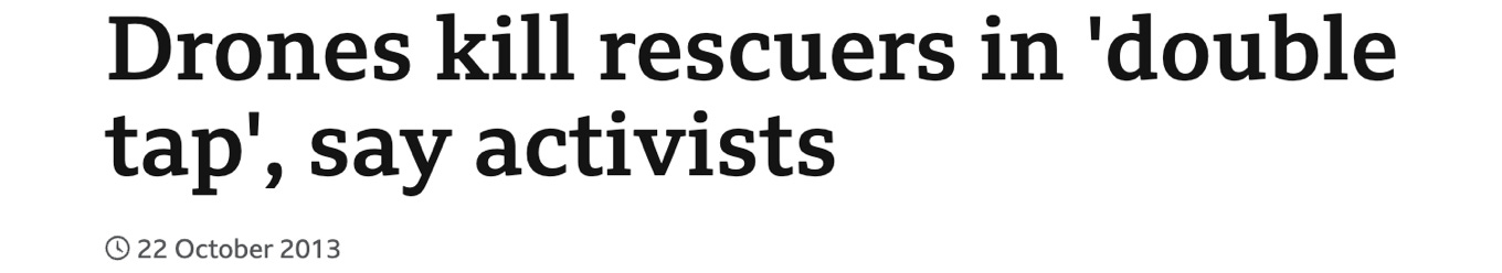 Here’s what sneaky Obama was getting up to: The military (or CIA) would launch a missile at a wedding or funeral where a terrorist was suspected of showing up. Then they would wait ten or fifteen minutes, and send a second missile, to kill all the rescuers and first responders who rushed in, hoping to capture a few more bad guys.