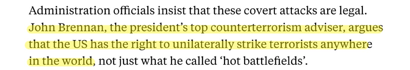 🚀 We wonder whether, in 2012, Democrats demanded investigations into Obama for war crimes? Nope. No, they didn’t. Democrats defended Obama’s strikes and double taps. No less a rotten apple than John Brennan, then Obama’s ‘counterterrorism advisor’, claimed that killing terrorists was legal anywhere, anytime: