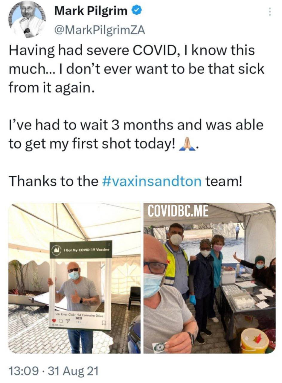 The good news is that Mark was convinced of the value of the safe and effective covid vaccines, and he believed the government that the jab would keep him from getting sick. Mark even got his first jab AFTER he had covid: