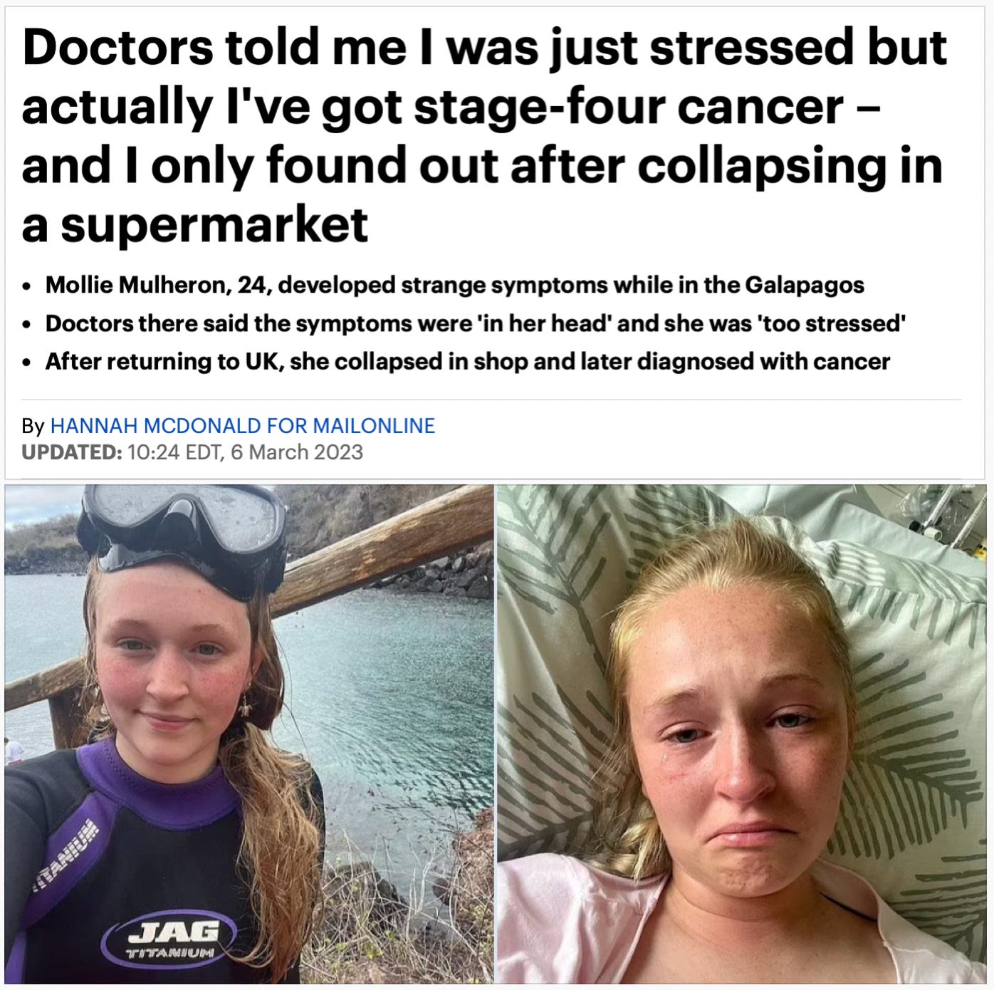💉 Last week, the Daily Mail UK ran a story about a 24-year-old English teacher from Yorkshire, Mollie Mulharon, who just got a sudden and unexpected turbo non-Hodgkins lymphoma cancer diagnosis, after being gaslit by her doctors who told her she was just imagining things and to quit bothering them with her hypochondriac nonsense: