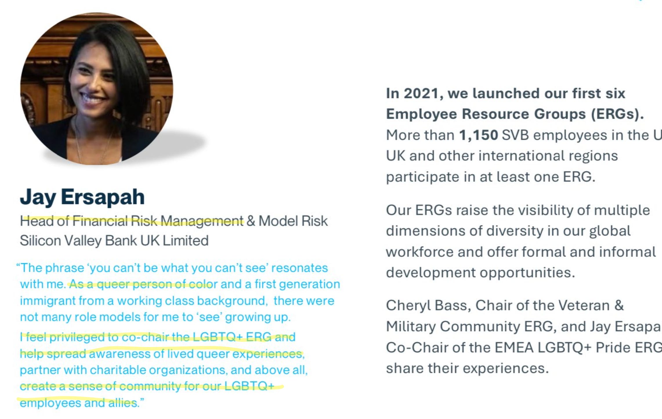 🔥 It didn’t take long to begin finding the diversity hires involved in the toppling of the first domino at Silicon Valley Bank, which pitched over faster than Mitch McConnell going down stairs at a swanky fund raiser. Meet Jay Ersapah, SVB’s queer diversity hire in charge of “Financial Risk Management.”