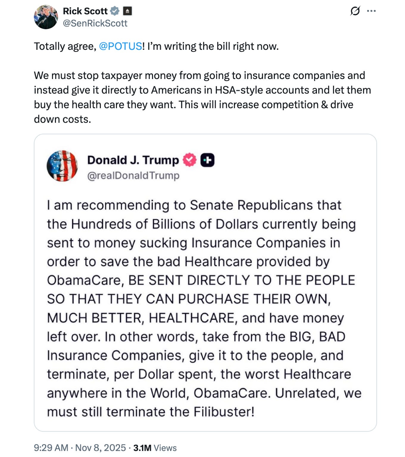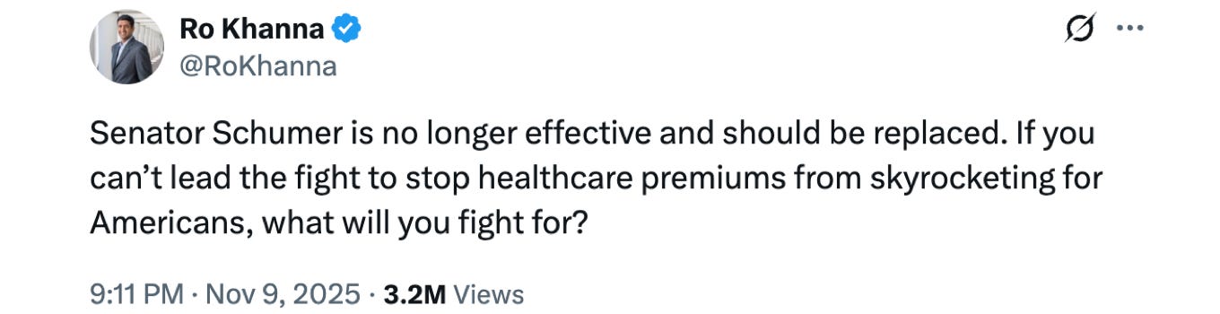 🔥 After making such a song about healthcare affordability and subsidies for the entire month of October (and all ten days of November), can the Democrats realistically vote against a Republican bill to help people pay for healthcare and subsidize patients (especially younger ones)? They will find some way to oppose it, of course, but it’s going to hurt.
