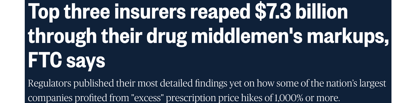 💉 This might not be intuitively obvious, but big insurance makes big profits from drug markups. Believe it or not, they mark up some drugs by as much as 1,000%. Headline from NBC News, January: