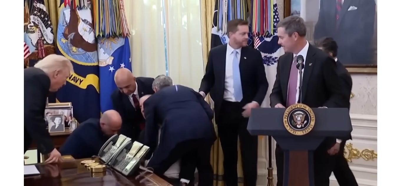 We have one more story about undignified collapses. I’d discounted this story when it fell over last week, for two reasons; first, the hot takes were off the charts, and second, while the story gripped the public imagination, the meaning remained muddled. But now, its metaphorical significance is unmistakably delicious. Yesterday, the Washington Post ran the story, below the headline, “Ten seconds in the Oval Office that overshadowed Trump’s drug-price win.