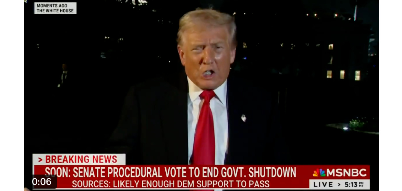 Yesterday’s top story was (cue drum roll): Democrats caved. They crumbled like week-old cornbread. They barked but never hunted. They folded like Sunday laundry. They teed up for a hole-in-one and shanked it into the woods. Politico ran the story below the simple but electrifying headline, “The shutdown endgame is here.” TAW.