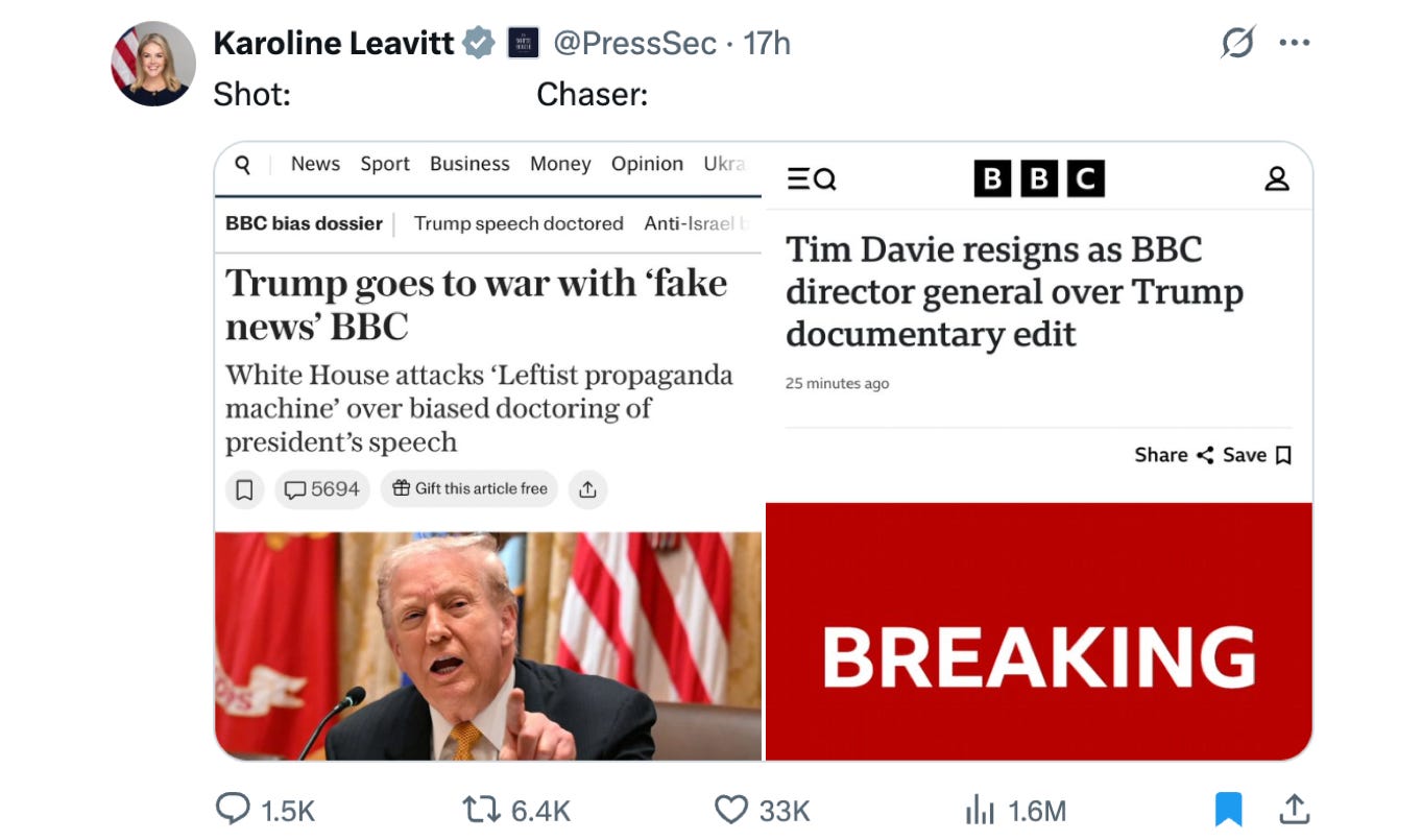 🔥 The BBC resisted all accountability for Clipgate since January. Three days after Trump “went to war,” in the form of Karoline Leavitt’s critical comments, the BBC crumpled like a limp biscuit.