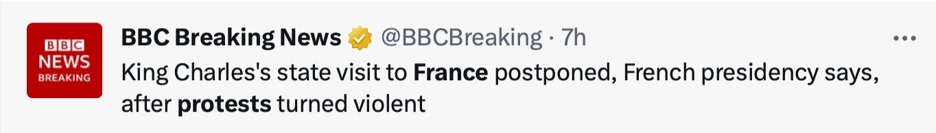 Yesterday, a long-planned state visit by Britain’s King Charles III, intended as a “celebration” of the two country’s strong relations, which included a swanky all-they-can-eat royal dinner in the splendoriforous Palace of Versailles, was rapidly rescheduled, due to “public relations and security concerns” by the Élysée, with French media rudely calling it a “humiliation” for Macron.