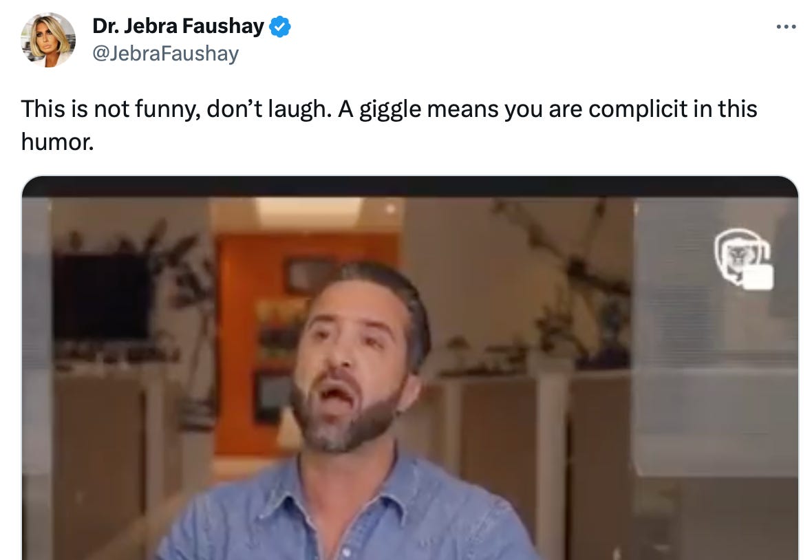 🔥 Finally, to start your weekend off with a smile, enjoy this hilarious parody published yesterday on the often-amusing Dr. Jebra Faushay’s satirical account:
