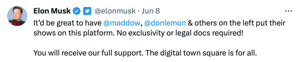 Nobody can criticize Elon for “allowing” Tucker to express himself on Twitter. Musk is busy encouraging differing opinions to come on, too. And I’m sure he means it. But, by linking Carlson’s show in the process of encouraging liberal influencers like Don Lemon and Rachel Maddow, Elon also promoted Tucker’s show to his own massive follower audience. So.