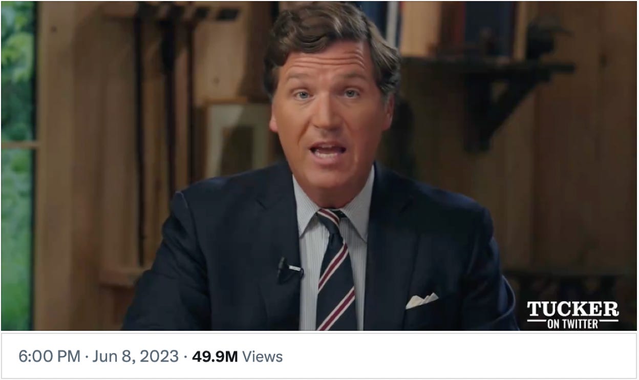 FIFTY MILLION VIEWS! In less than 24 hours. That’s the power of Twitter. Tucker may have lost the imprimatur and positive brand association from being on Fox. But he’s gained a much bigger audience. And I wonder if there are some folks who would have never watched Tucker, BECAUSE he was on Fox, who might now give him a try. In other words, whatever Tucker lost from disaffiliation, he seems to be gaining in other ways.
