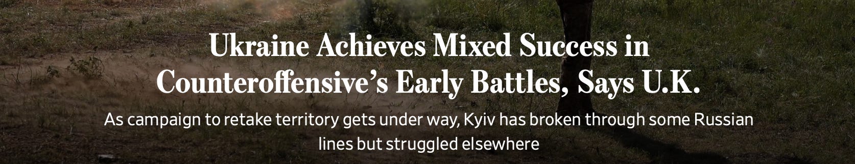 Meanwhile, the Wall Street Journal ignored Ukrainian officials, and ran an artistically-decorated, mildly optimistic-sounding headline about the CounterOffensive, but immediately undermined the story’s credibility by attributing it to the British right in the headline (“says UK”):