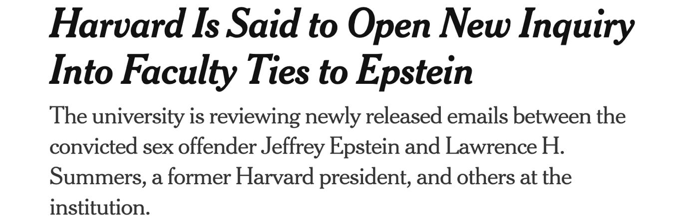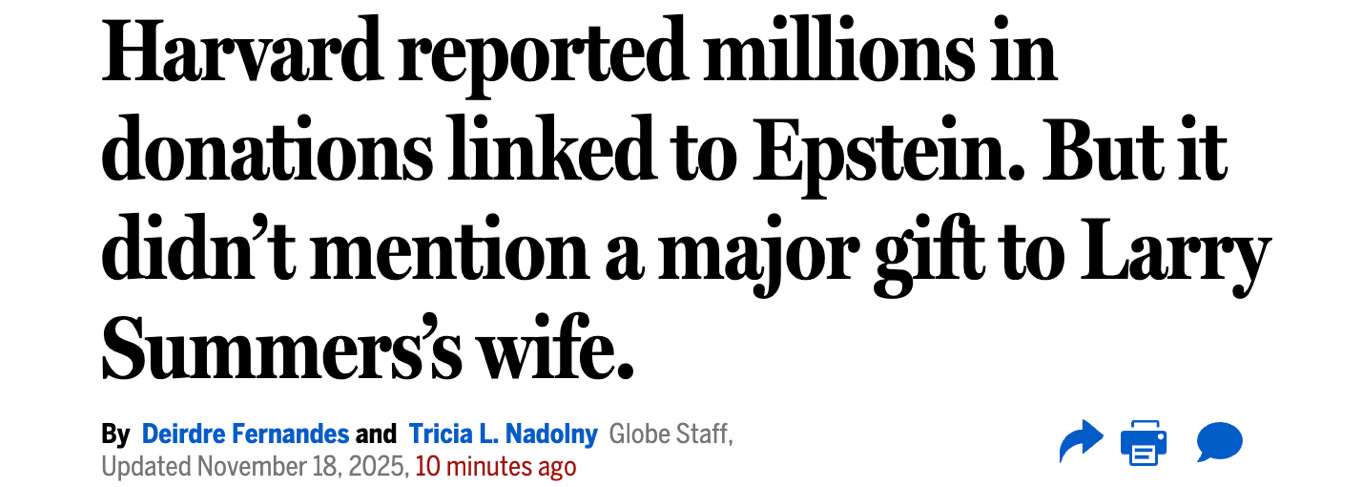 Harvard did a whitewashing investigation and report on itself in 2020, absolving the school from any financial ties to Epstein. But the Boston Globe reported that the major gift from Epstein to Larry Summers’s wife, creating a “major” Harvard poetry project, wasn’t mentioned in the 2020 report at all. “The omission,” the Globe said, “raises new questions about the thoroughness of that investigation, which Harvard has repeatedly cited when asked about its connections to Epstein.”