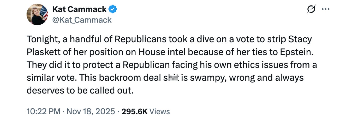 🔥 Yesterday, House Republicans tried and failed to censureVirgin Islands Representative Stacey Plaskett, who was shown collaborating with Epstein by text during a Trump impeachment hearing. Apparently, the Democrats successfully deployed a threat to also censure Cory Mills (R-Fl.), and it worked. Here’s Florida Representative Kat Cammack’s take: