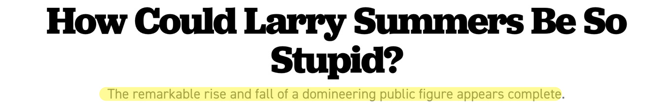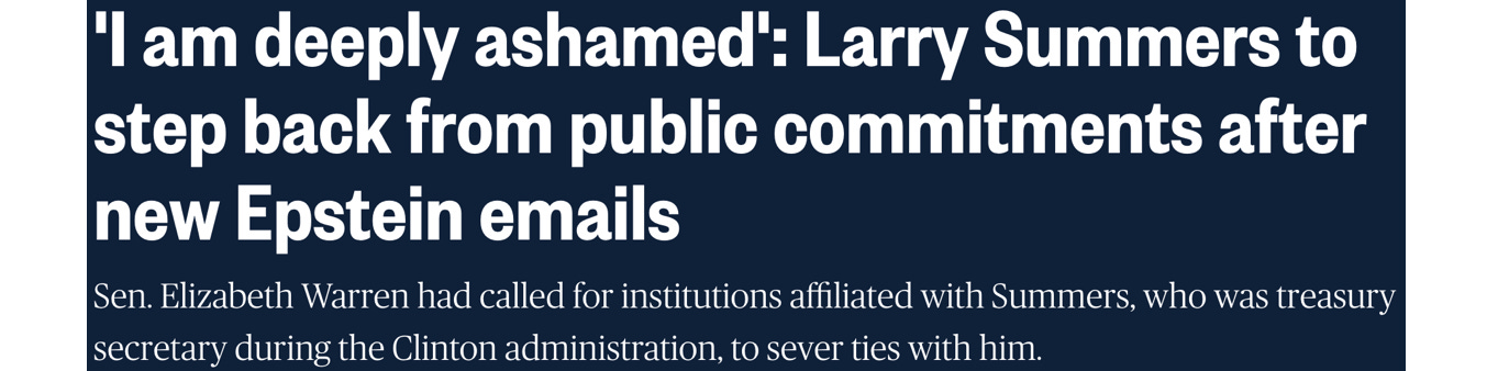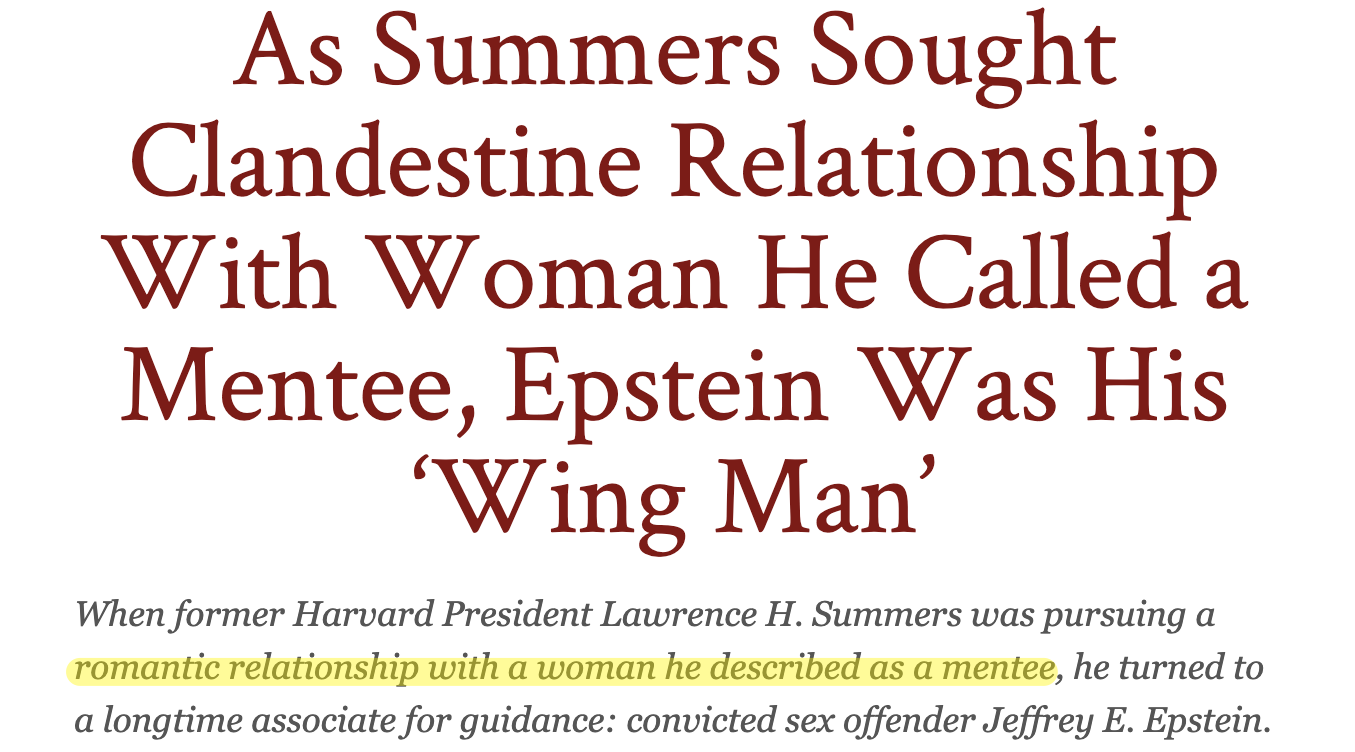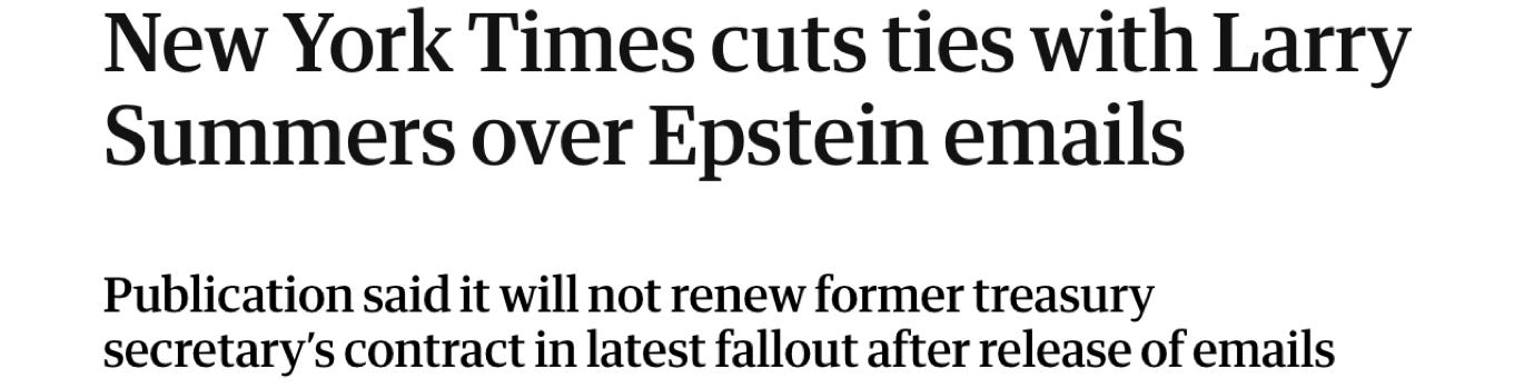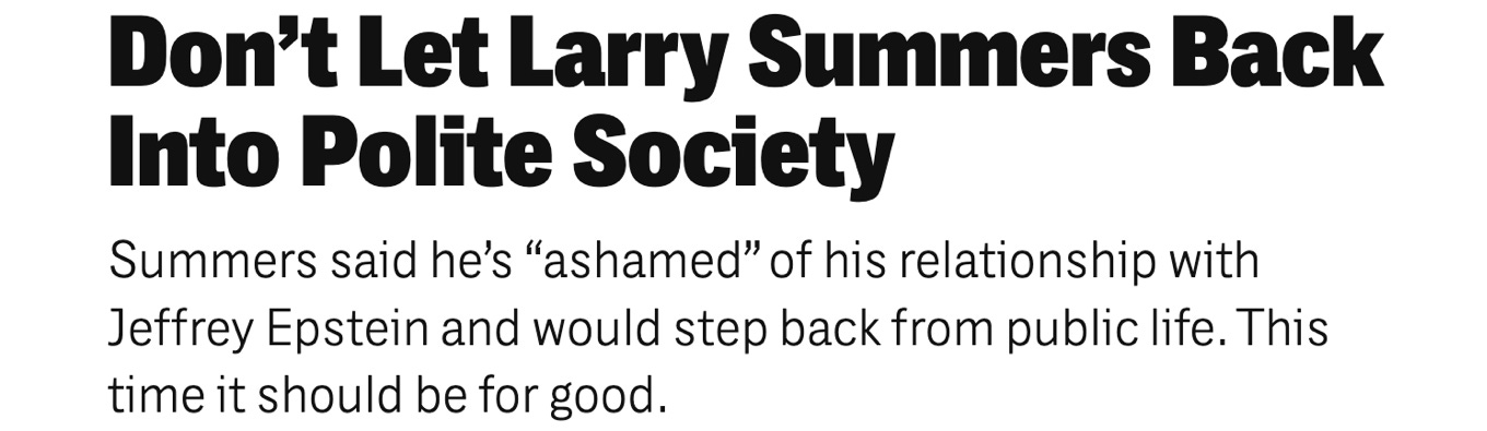 🔥 Last week, the world learned that Summers was also terrific buddies with that jet-setting International Man of Mystery, Jeffrey “Lolita” Epstein. I shall illustrate the fallout in a series of headlines from the last three days. First up, the New York Times, this morning: