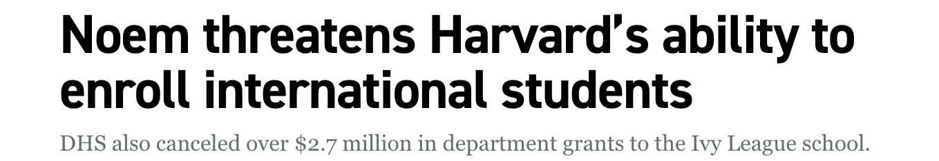 Next, how about DHS? Well, for most of this year, Secretary Kristi Noem has been busily clubbing Ivy League schools with the threat of decertifying all their foreign visa contracts. Headline from Politico, late April: