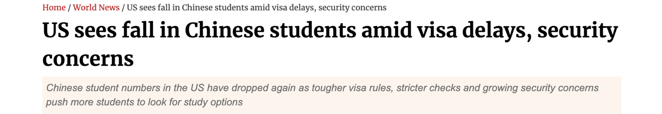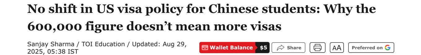Remember how I told you to focus on what Trump does, not what he says? What do you think is really happening with numbers of Chinese student visas? Here’s a headline from two days ago published in the Business Standard: