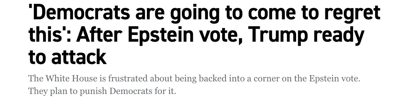 Immediately, even before the vote, blows began to land on progressives. The good news is, Democrats’ Epstein pain is only going to last for a very long time. Yesterday, during a White House meeting with Saudi Arabia’s Crown Prince, Trump even said Democrats would be sorry about opening Epstein’s pandora’s box. Politico, yesterday:
