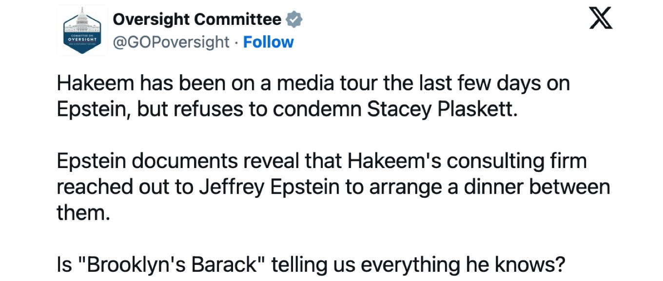 🔥 Yesterday, Newsweek ran a story headlined, “Hakeem Jeffries stung by new Jeffrey Epstein revelations.” Hakeem Jeffries is the top Democrat in the House of Representatives, their Minority Leader. Now he has an evolving Epstein problem, though not yet as profound as Larry Summers’s.