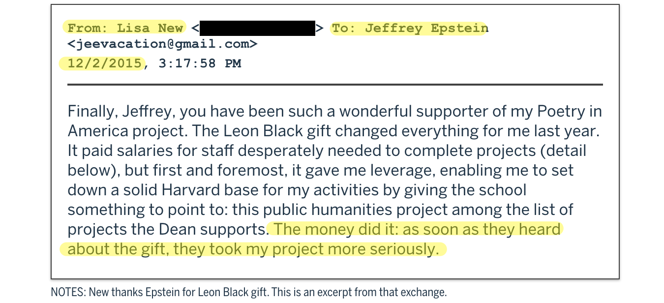I’ll interrupt the headlines with the email from Lisa New (Summers’s wife) to Jeffrey Epstein in December 2015—well after his sex-trafficking conviction. Epstein gave her a bunch of money for poetry. Behold: