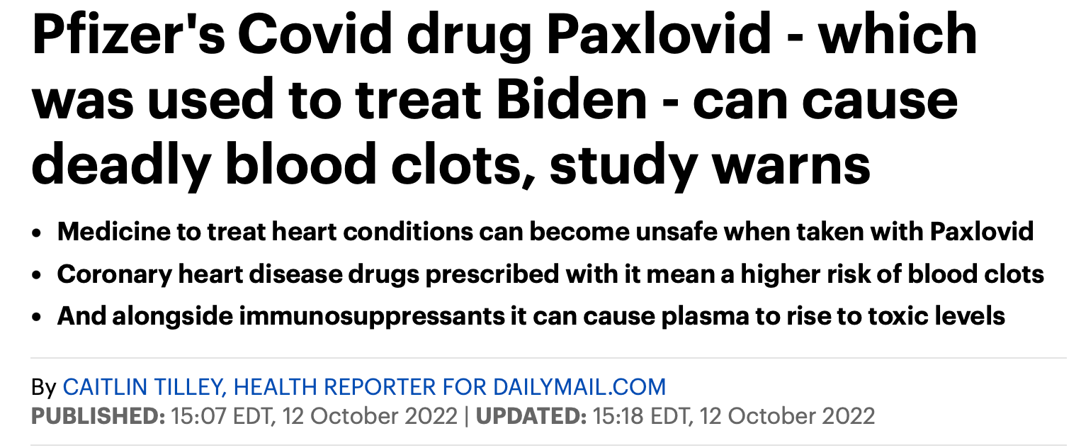 Look, I know it all looks very sus and shady, but I think it’s great. After all, Paxlovid has been PROVEN to work; it works super well for people infected with covid. I mean, hasn’t it? Okay, technically, there aren’t any independent studies showing efficacy or anything, and it’s true Pfizer has never run the clinical trials needed for Paxlovid’s non-emergency approval, and granted there’re tons of anecdotal reports that folks got covid TWICE after taking it, and of course new studies show it can cause fatal blood clots, but APART FROM THAT it works terrific!