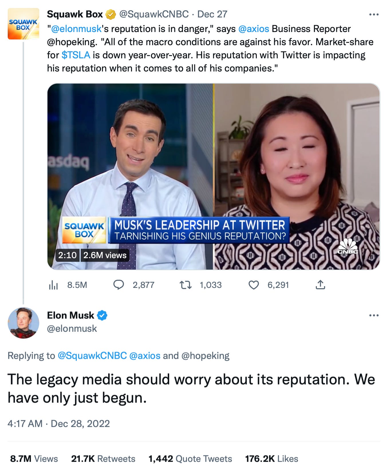 Check out those numbers. The Squawk Box and Elon’s tweet both got around the same number of views. But the numbers of likes and retweets are even comparable. Think about that for a second. Should the Squawk Box conclude it has the more persuasive argument? Does it look like Musk’s “reputation” is “tarnished” to you?