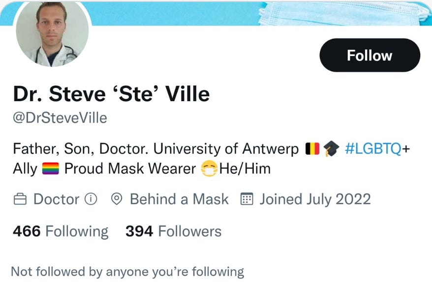 According to the Standard, the two fake doctors, whose accounts constantly urge extreme covid caution, are part of an interconnected network of AT LEAST four fake accounts all touting their ties to the LGBTQ+ community, vocally advocating mask-wearing, jabbing, and social distancing, and dishing out generous helpings of criticism to folks they felt are not taking the pandemic seriously enough.